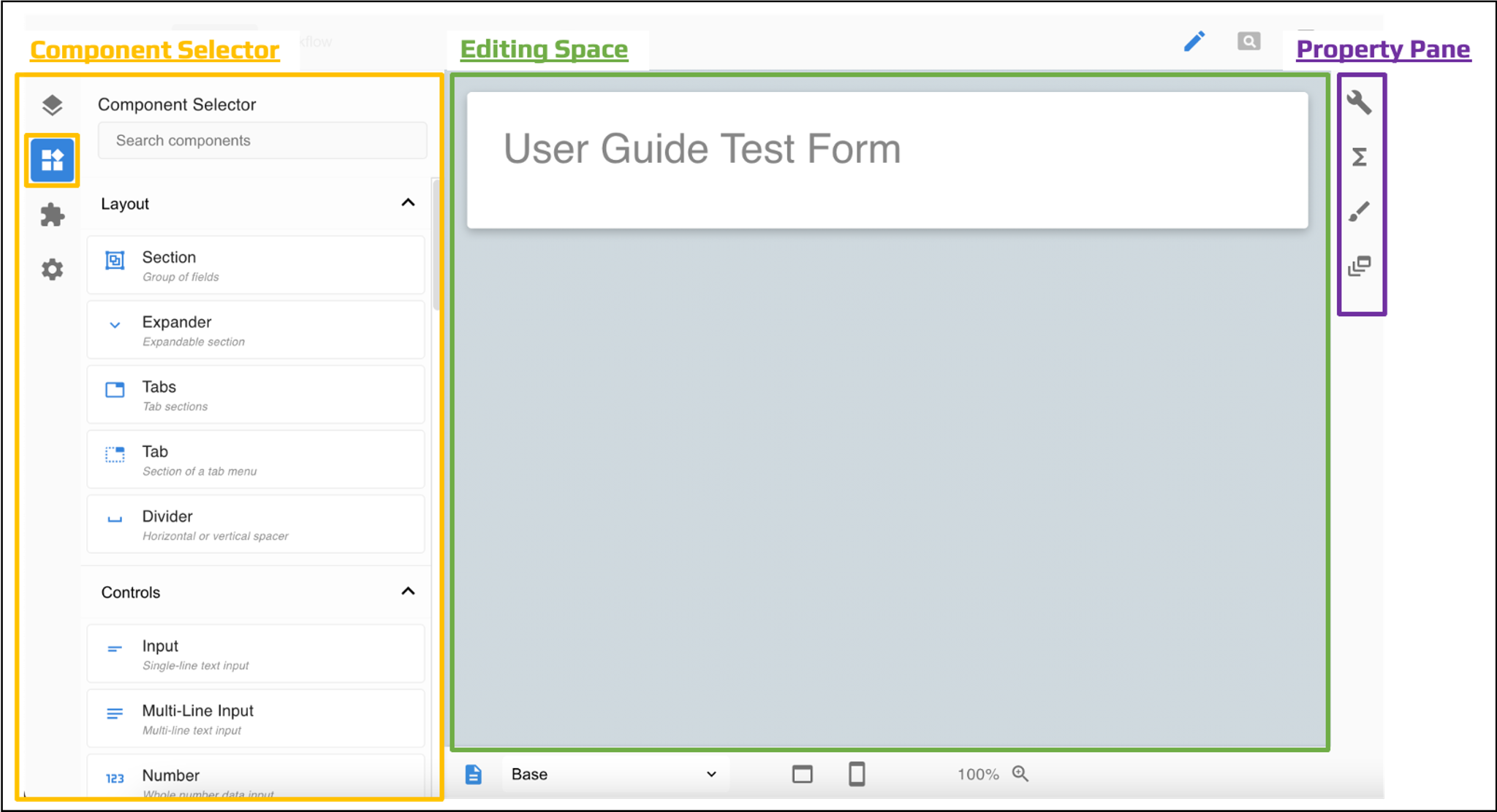 In Edit Mode in the Designer, you will see the Component Selector, Editing Space, and Property Pane. Below we go into detail on how to use each of these.