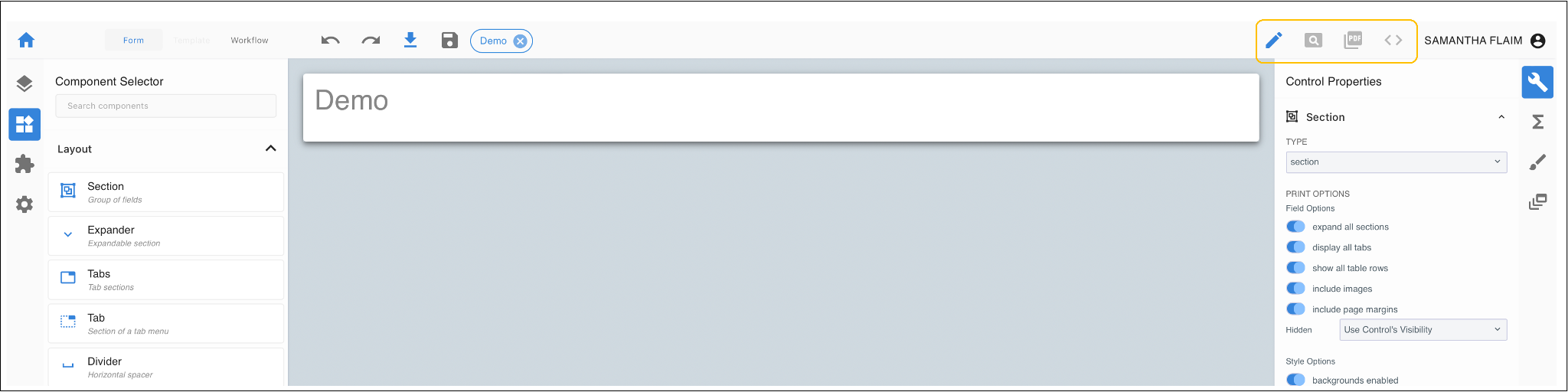The Form Designer is organized into four distinct modes, each serving a specific purpose. You can easily switch between these modes using the tabs located in the top right corner: